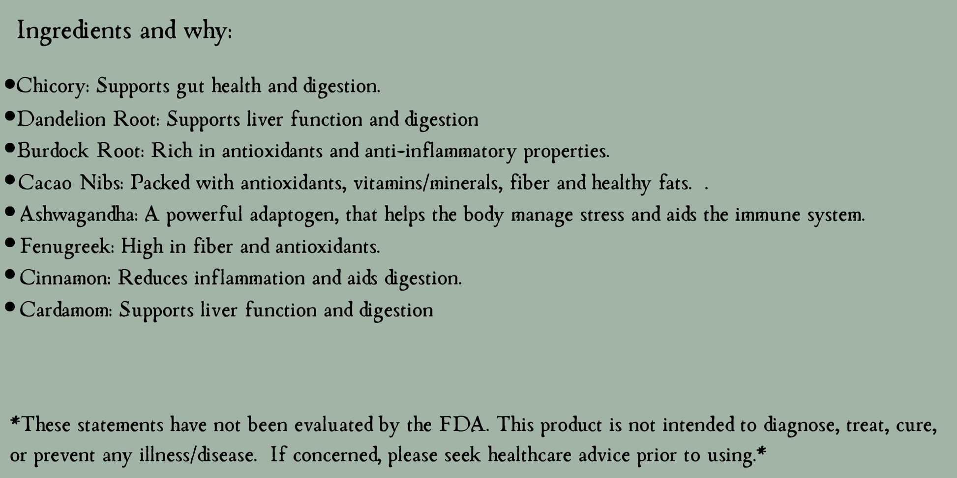 Ingredients: Chicory, Dandelion Root, Burdock Root, Cacao Nibs, Ashwagandha, Fenugreek, Cinnamon and Cardamom